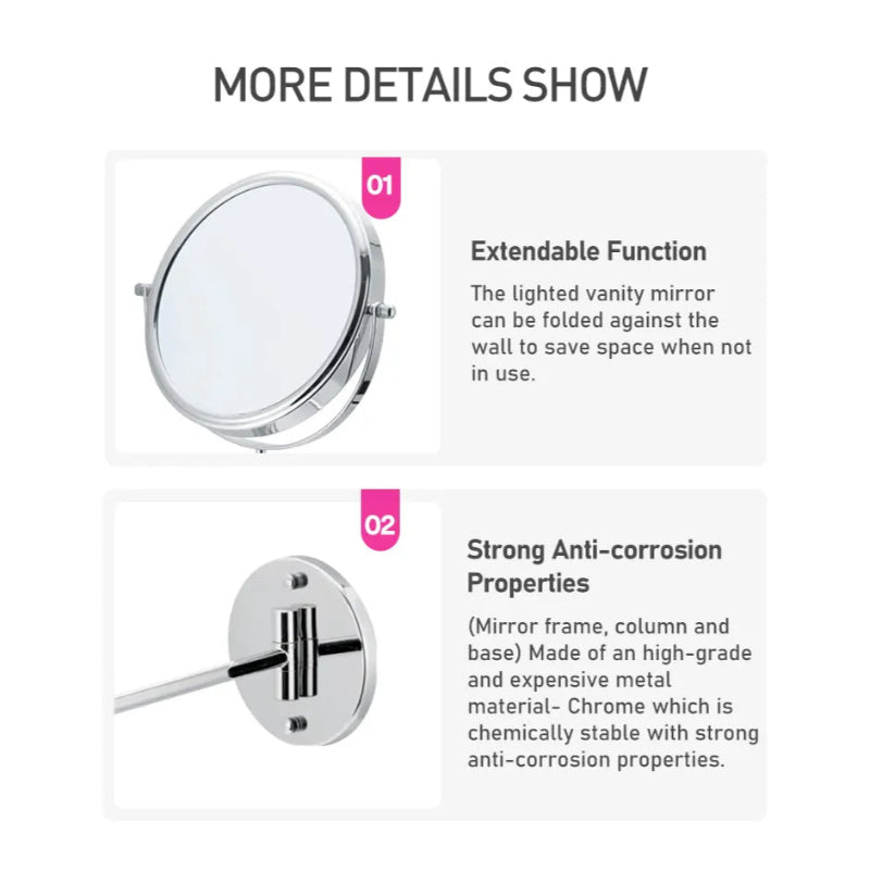 Makeup Mirror 360° Moveable for Dressers, Bathrooms | 8" inches Magnifying + Normal Dual Mirror | Wall-Mounted