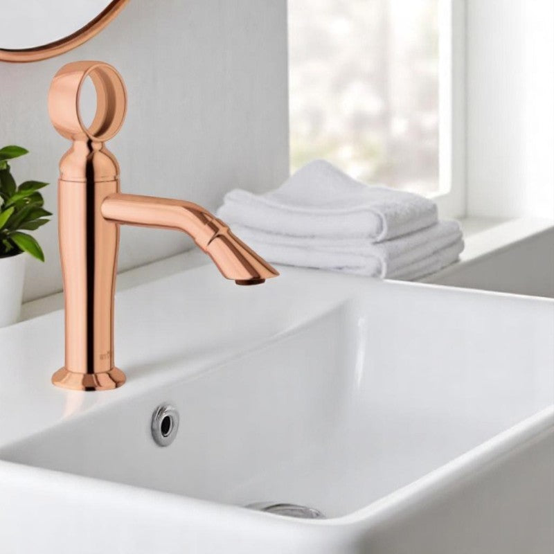 This Bathroom Wash Basin Faucet features a unique Ring Design in a luxurious Rose Gold finish. Its Hot and Cold Mixer allows for easy temperature control, providing a comfortable water flow for your daily needs. Elevate your bathroom experience with this elegant and functional faucet.