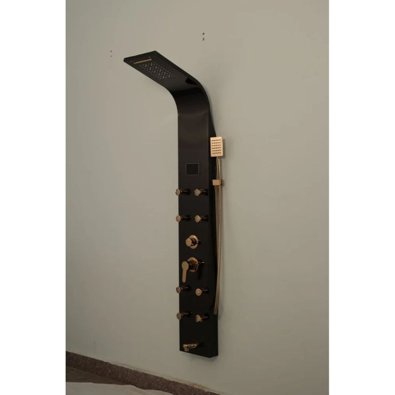 Experience the ultimate luxury with our LED Shower Panel 5 in 1. This multifunctional panel features a stainless waterfall, rainfall shower, 8 body massage sprays, and a temperature display. The 5-in-1 tower system also includes a handheld spray for added convenience. Easily connect and mount this panel for a spa-like shower experience.