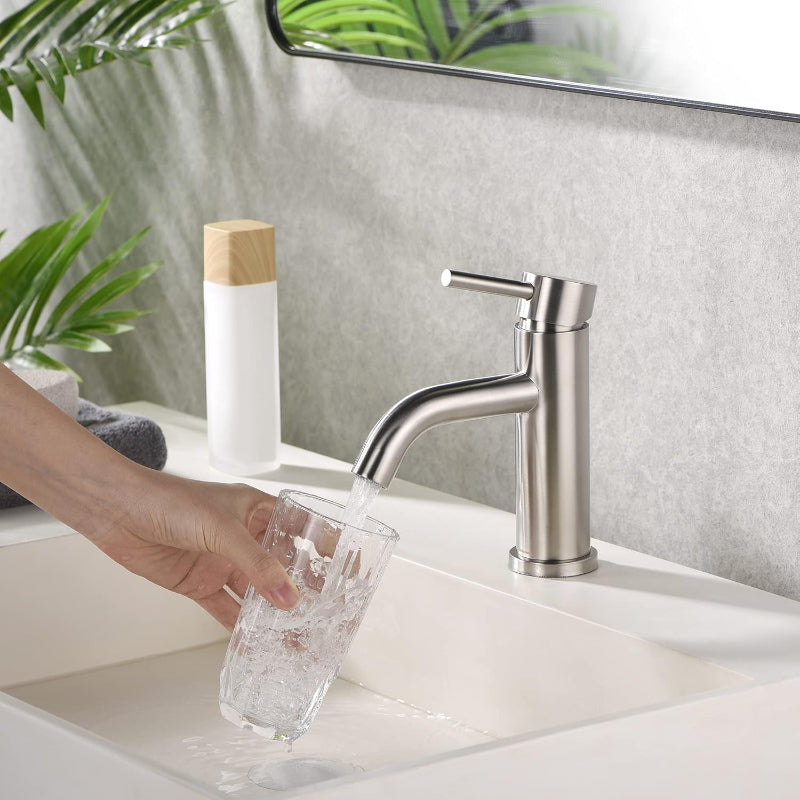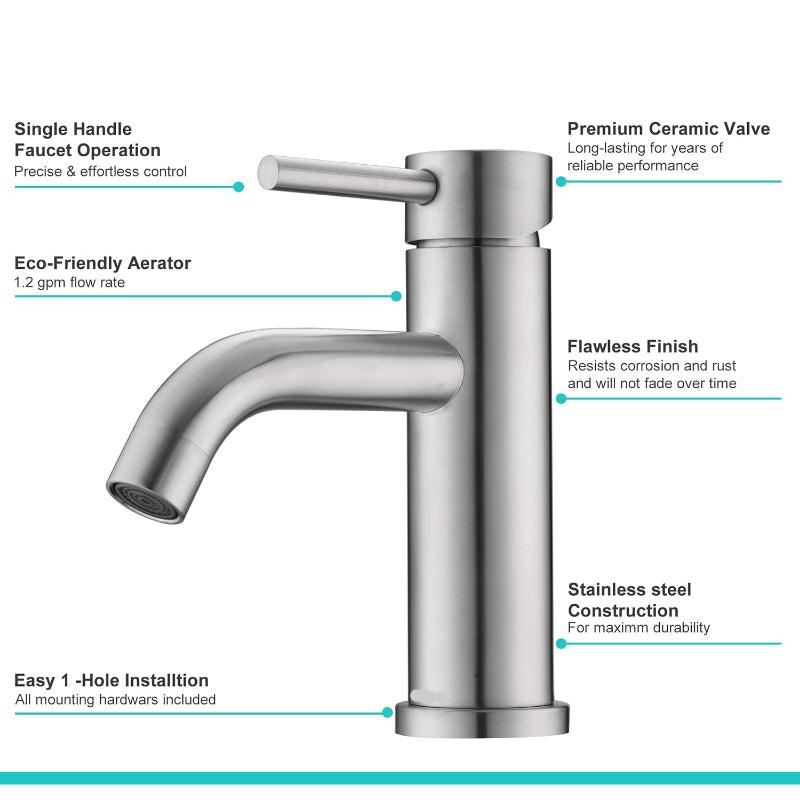 Bathroom Faucet: This sleek and contemporary bathroom sink faucet is designed with a single hole for easy installation. The single-handle design allows for effortless water flow and temperature adjustment, providing convenience and precision. Crafted with high-quality materials, including commercial-grade SUS 304 stainless steel, this faucet ensures durability and reliability. Its chrome-plated finish adds a touch of elegance to your bathroom decor, creating a stylish and modern look
