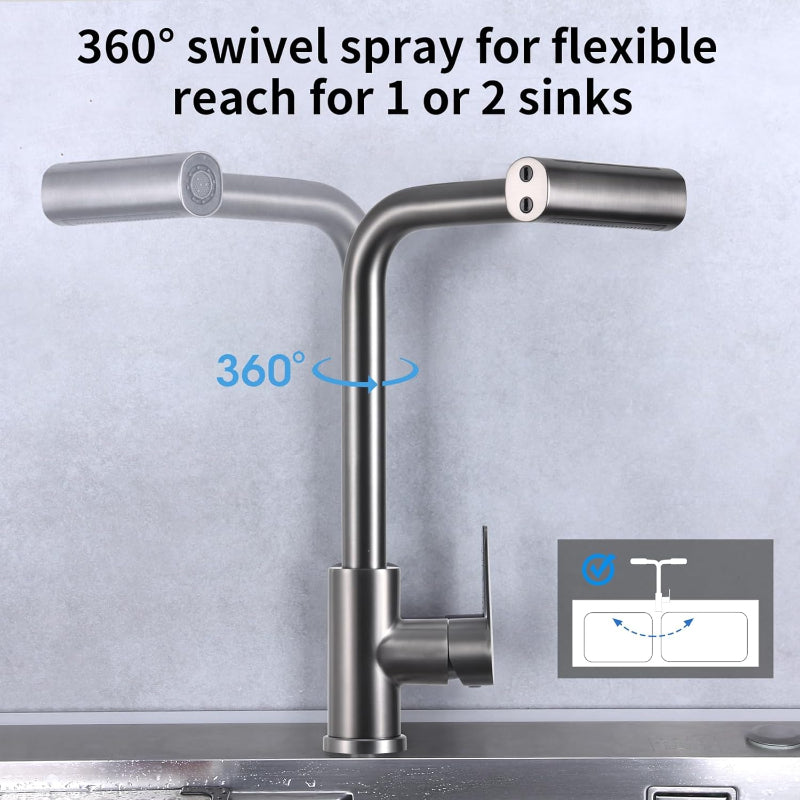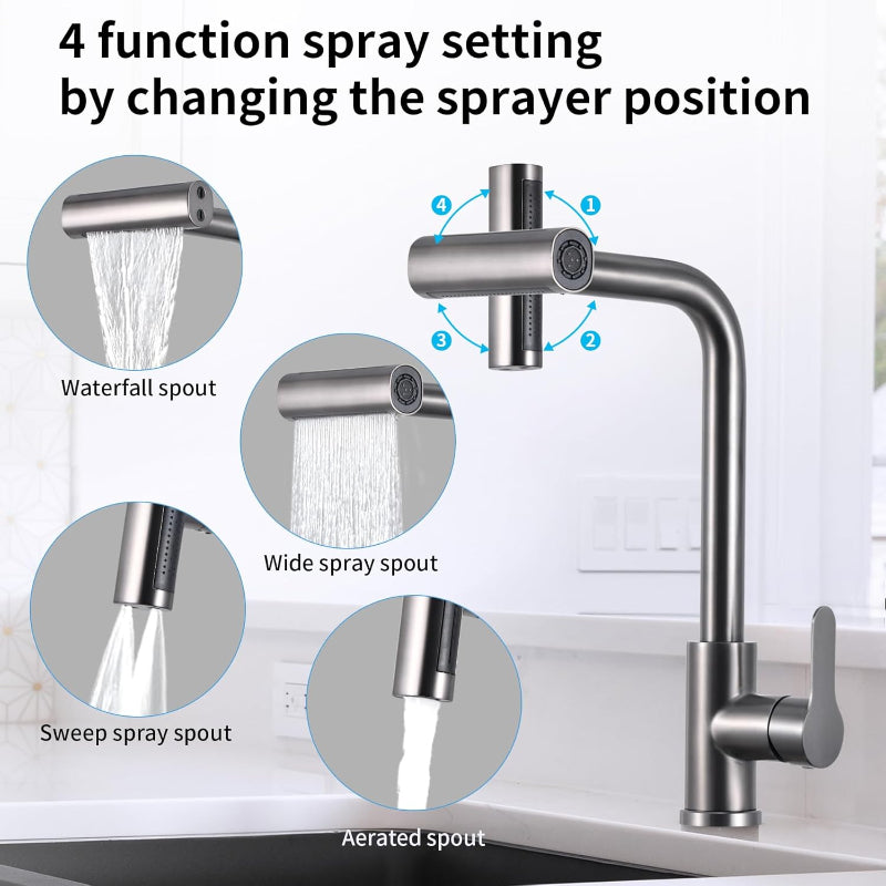 Upgrade your kitchen with our Premium 4-in-1 Waterfall Kitchen Faucet. The 360° moveable design and stainless steel body with ABS plastic sprayer provide convenient and durable functionality. With a hot and cold mixer, enjoy the perfect water temperature every time.